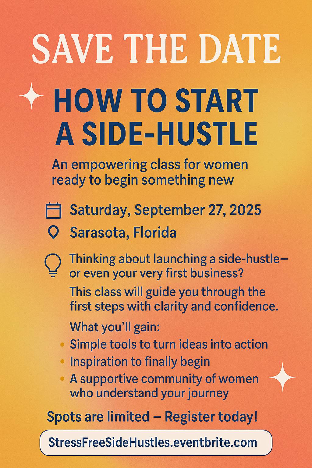 The Strength We Find in Each OtherHello Reader, Every week when I sit down to write this newsletter, I am reminded of how grateful I am for you. What makes it so meaningful is knowing there are women out there on the same path—women who are dreaming, building, and finding ways to create something new in their lives. Sharing ideas, tools, and encouragement with you has become one of the highlights of my week. In 2020, when the COVID lockdowns began, like many of you, I suddenly had something I had never really had before—time. The world slowed down, the calendar emptied, and I was left with the quiet to reflect on my life. I started to ask how I wanted to spend this found time. I began to see things differently. I realized that so much of what I thought I wanted wasn’t necessary to make me happy. What mattered most was what I already had. I made the decision to spend my time with more intention. I embraced the moments with my family, treasured afternoons in my garden, and enjoyed being with close friends I had often been too busy to see. Those simple joys reminded me of the value of time itself and the importance of being intentional with my relationships and my energy. That decision has shaped the way I live today. It also inspired me to think about how I can help other women make intentional choices about their time, their work, and their possibilities. Along the way, I’ve realized how important it is for growth to nurture a sisterhood. Being surrounded by women who encourage you, share wisdom, and celebrate your progress brings strength and joy to the journey. We grow stronger in sisterhood, and we can accomplish more when we lift each other up. Something New This September!Out of that same spirit, I have created a workshop to help women carve out possibilities in their own lives. ✨ Start Something Small: A Workshop to Explore, Plan and Launch Your Side Hustle ✨ This is an in-person, hands-on, two-hour session designed to meet you wherever you are on your journey. For some, it may be about simply generating ideas for the future. For others, it may serve as an educational experience to learn what’s possible. And for many, it will be a way to focus on the possibilities and begin bringing those ideas to light. Just as important, this will be a chance to connect with other women who are on the same path. Sometimes that in-person connection makes all the difference. It’s how we nurture sisterhood, find encouragement, and remind ourselves that we’re not doing this alone. ➡️ Get all the details and sign up here —Susan P.S. In-person connection can be powerful. I hope you’ll be part of it.